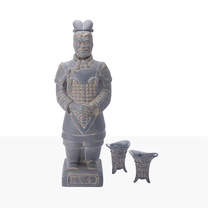 介紹影片: 商品簡述: 模擬真實西安秦俑去設計,身材高大魁梧,頭戴雙卷尾冠、身穿雙重長襦,外披魚鱗甲,足穿方口翹尖履,長髯飄盪昂首挺胸,顯得威武大度、雄風逼人,勃發出陽剛之氣。實是贈禮收藏兩相宜。 附贈2個杯子,以青銅杯的外型去設計又名「爵杯」搭配秦俑酒更是別有一般風味。